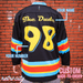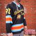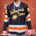 This custom hockey jersey, inspired by The Big Lebowski, features a black base color with columbia blue/orange/gold stripes, the famed 'Hollywood Star Lanes' script and star on the front, the famed 'Bowl' neon sign from Hollywood Star Lanes on the left shoulder and below the back collar, a reminder that the joint never closes on the right shoulder, and sleeve numbers.