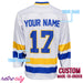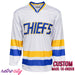 This custom replica hockey jersey from the 'Slap Shot' movie features a white base with gold and royal blue stripes and text.