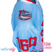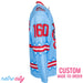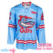 This lace-up hockey jersey is custom-made to order with whatever name or number you want! It features a columbia blue base color with dark columbia and white "teeth" marks, red and white stripes, sleeve numbers, the Gatrs logo on the front and shoulders, and front Japanese text that translates to 'Feraligatr'.